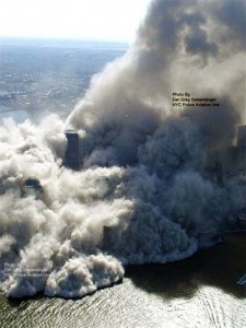 In this Sept. 11, 2001 photo made by the New York City Police Department and provided by ABC News Tuesday Feb. 9, 2010, smoke and ash rise as a World Trade Center tower burns at left center, after terrorists flew two airliners into the World Trade Center towers. AP Photo/NYPD, via ABC News, Det. Greg Semendinger ) MANDATORY CREDIT